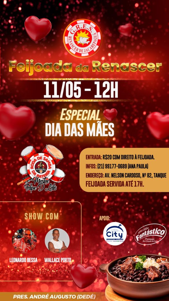 A Família Renascer convida todos os apaixonados por samba para sua Feijoada Especial Dia das Mães com apresentação da tradicional roda de samba da bateria Guerreira com as participações de Leonardo Bessa e segmentos e Wallace Porto.