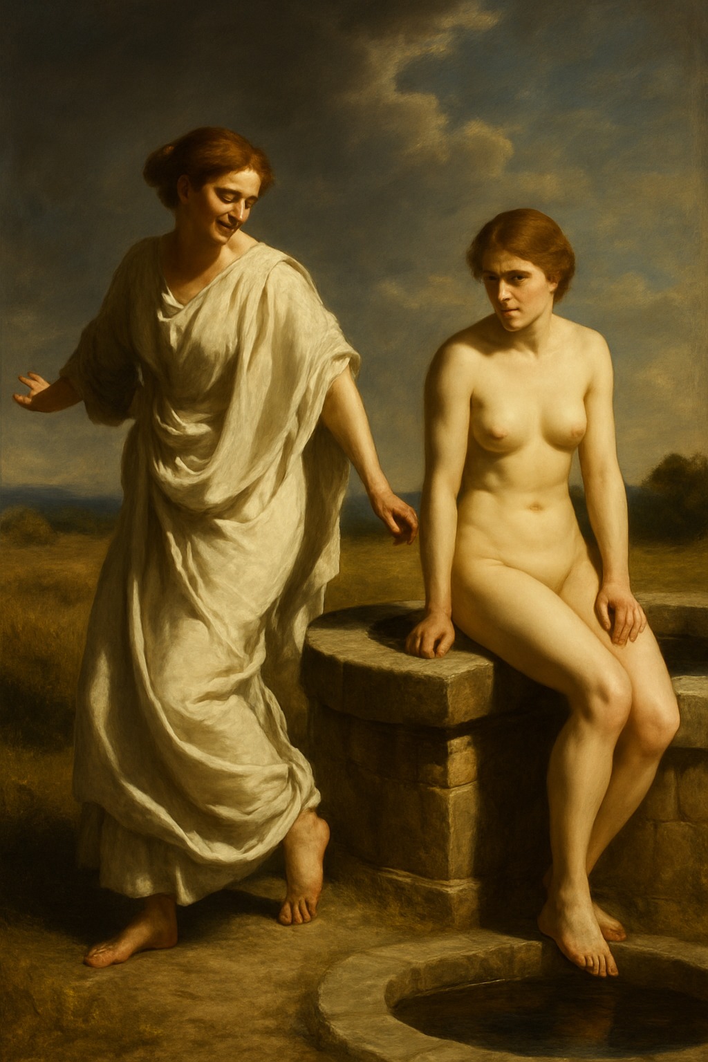 A verdade, sendo cautelosa, testou a água e, ao constatar que estava realmente agradável, aceitou o convite. Ambas se despiram e entraram na água.