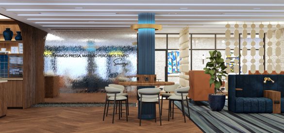 O design do novo espaço VIP tem como foco o conforto e a hospitalidade, com uma atmosfera que une modernidade e tradição, inspirada na cultura portuguesa. O uso de materiais como cortiça e mármore Lioz, além de uma paleta de cores equilibrada entre azul, dourado, nogueira e preto, propõe um ambiente sofisticado e acolhedor. Rebeca explica que o conforto foi uma das prioridades do projeto, aliado a um mobiliário ergonômico de texturas suaves, que proporciona uma experiência de relaxamento. “Também optamos por valorizar a cultura portuguesa: através da arte de azulejos e com base em referências literárias, como a obra do escritor José Saramago, além de paisagens do Vale do Douro, a vinícola”, detalha.