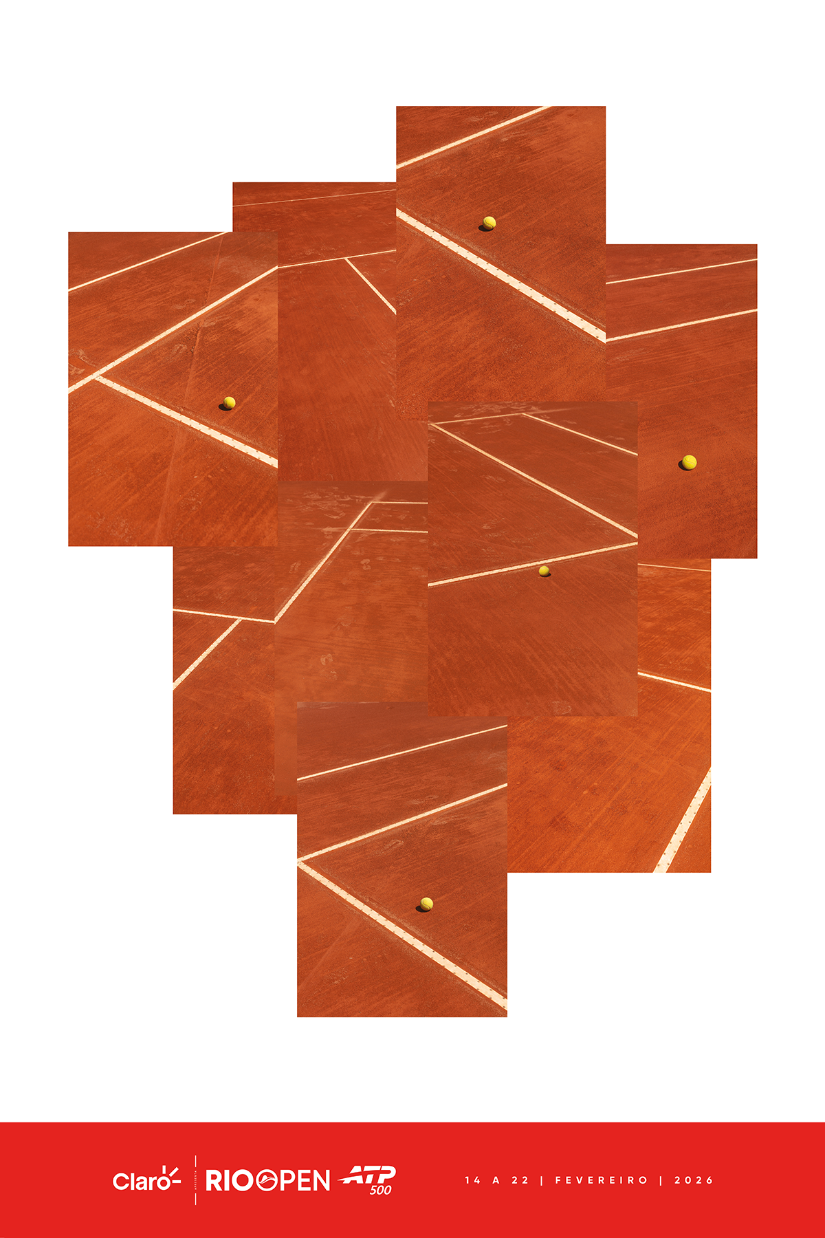 A obra criada especialmente para o Rio Open 2026, intitulada “Crux”, faz parte da série Justapostos (2008–), na qual uma paisagem é dissecada em vários planos distintos enquanto as perspectivas são reestruturadas em um novo arranjo visual. Na imagem, Marcos Chaves desconstrói a quadra de saibro e a reconstrói visualmente, transformando-a em um instrumento de desorientação e redescoberta.
