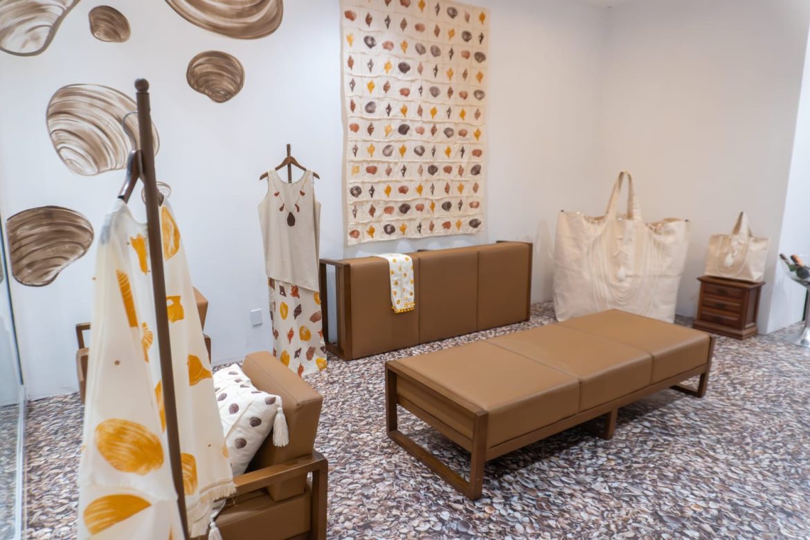 A exposição apresenta uma coleção de peças inéditas que traduzem a “matéria viva” da história local. O acervo inclui almofadas em patchwork com estamparia artesanal, colchas, clutches, bolsas e itens de vestuário. Um dos destaques é a maxi-bolsa inspirada no colar sambaquiano, peça que simboliza a conexão entre a moda contemporânea e os vestígios históricos da região.