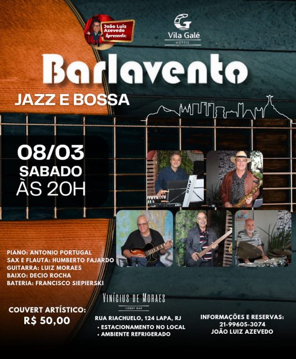 O piano bar Vinicius de Moraes, anexo ao Hotel Vila Galé no Centro do RJ e o produtor cultural João Luiz Azevedo têm o prazer de apresentarem o show da banda BARLAVENTO que tocam o melhor do jazz e bossa nova.