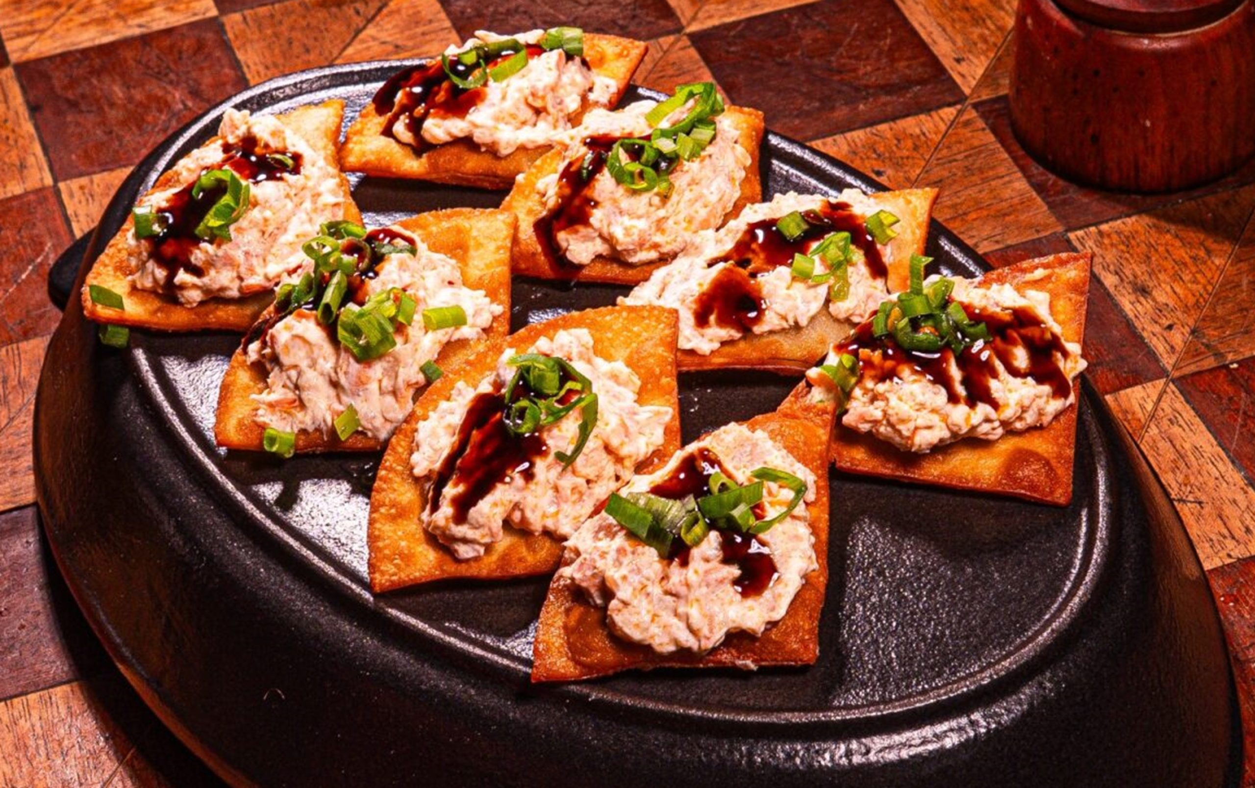Nos petiscos, as opções incluem Camarão Crocante (camarões empanados acompanhados de molho tártaro R$ 59,90) e Massa de pastel aberta crocante de Salmão, com cream cheese e cebolinha (R$ 44,90).