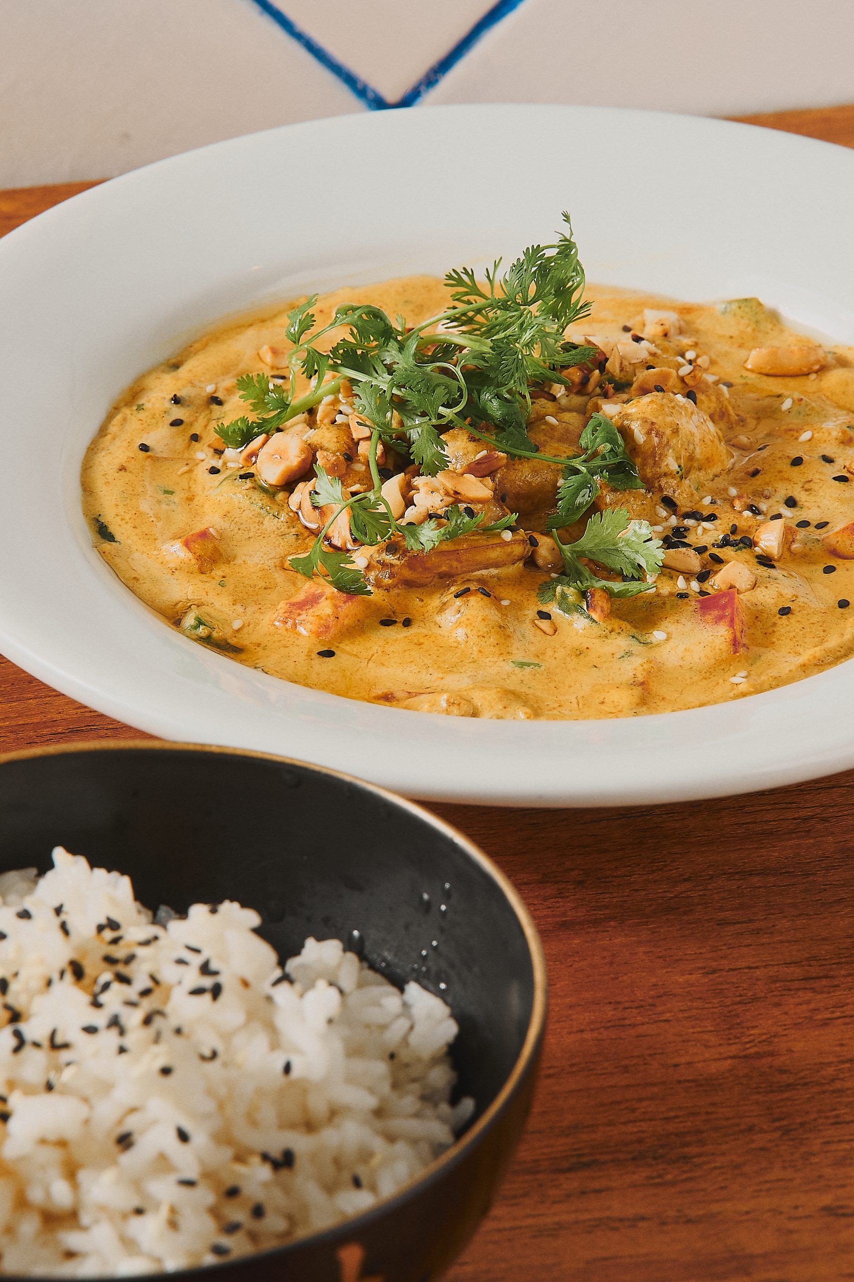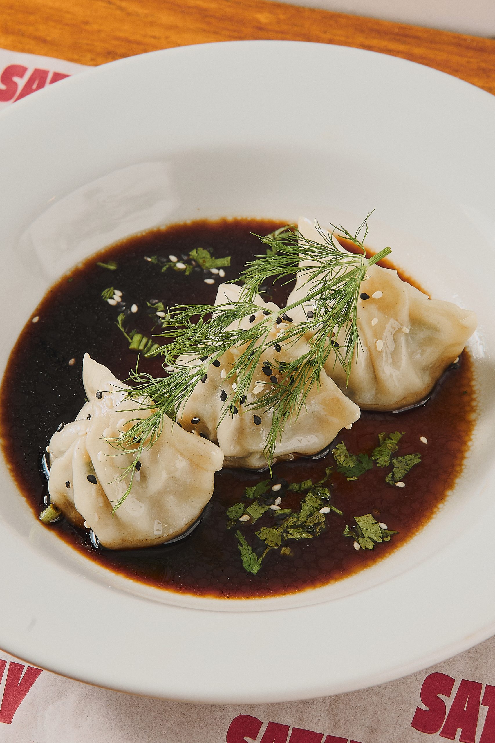 No menu, a estrela é o Satay Clássico, servido em versões de frango, camarão ou mignon, acompanhados do tradicional molho de amendoim. A partir daí, o cardápio se desdobra em uma seleção de hits da comida de rua asiática, reinterpretados com técnica e sabor. Entre as entradas, destaque para o ovinho frito marinado com aioli picante de gochujang, e para os baos, pãezinhos de origem chinesa servidos no vapor com recheios variados: porco com picles e aioli de gengibre e costela desfiada com kimchi e aioli de alho assado, e a versão vegetariana, com cogumelos salteados e toque de coentro.
