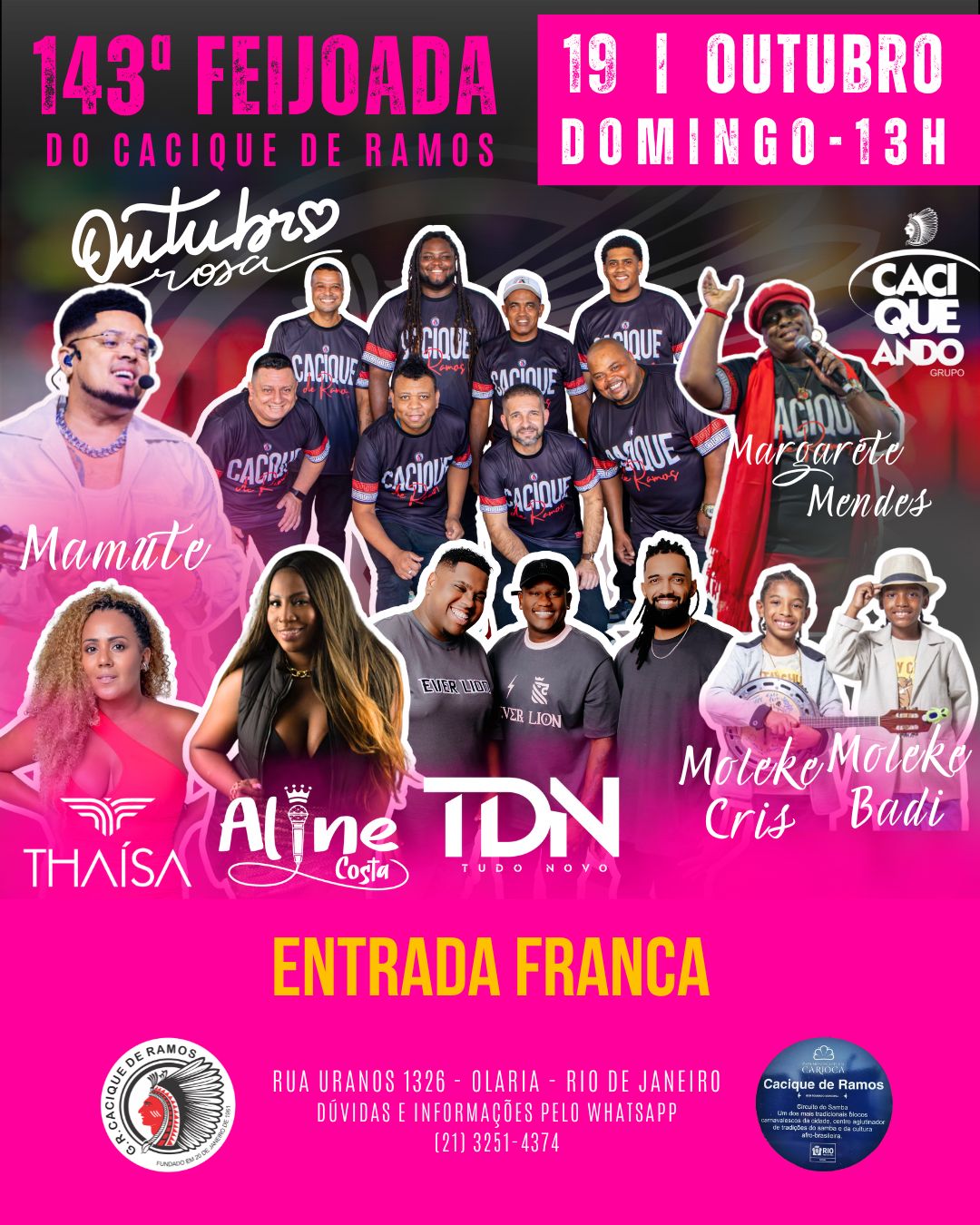 O evento acontece na quadra do Cacique de Ramos, localizada na Rua Uranos, 1326, Olaria, Rio de Janeiro. Informações podem ser obtidas pelo WhatsApp: (21) 3251-4374.