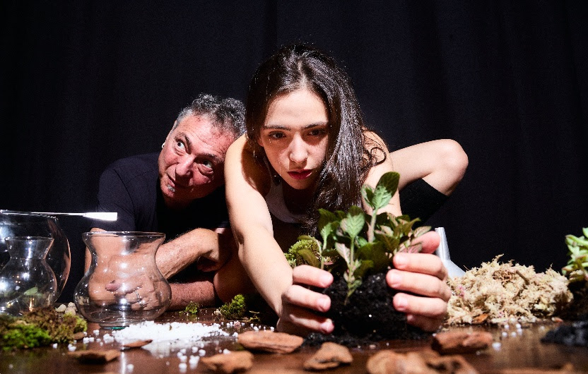 A cena traz uma grande mesa e estantes ao redor. Elas abrigam ferramentas e terrários(*) de diferentes tamanhos e formatos. Ao longo de cada apresentação e da temporada, a filha montará novos terrários, que irão se acumulando no cenário até o final da temporada. Haverá em cena uma câmera captando detalhes deste trabalho manual e o projetando em tempo real num telão em formato de semicírculo acima dos atores.