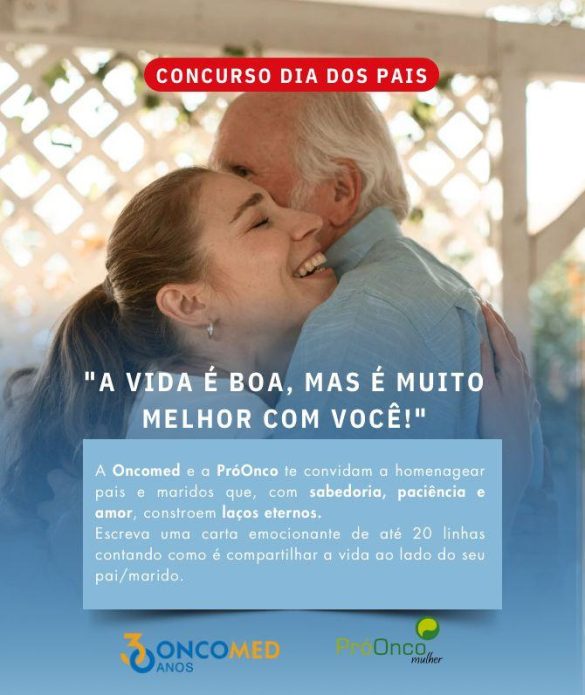 Parceiras há quase uma década em ações diferenciadas voltadas à saúde da mulher, a Oncomed e a PróOnco se unem agora em um projeto totalmente inovador. Marcando o Dia dos Pais, a homenagem dessa vez será para homens que acompanham o desafio de esposas ou filhos que foram pacientes ou seguem em tratamento do câncer nas duas clínicas referência de oncologia no Grande Rio. Pais ou maridos poderão ter suas histórias contadas em cartas enviadas até o próximo dia 1º de agosto para o concurso que tem como slogan “A vida é boa, mas é muito melhor com você” e vai premiar a mais emocionante delas.