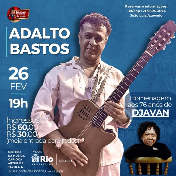 O produtor João Luiz Azevedo tem o privilégio de apresentar o show do cantor compositor ADALTO BASTOS em homenagem ao grande DJAVAN, que completou 76 anos no dia 27/01/2025, no dia 26 de fevereiro/2025 – 4ªf, 19h, no Centro da Música Carioca Artur da Távola (Rua Conde Bonfim 824 – Tijuca) no Projeto Quartas Acústicas.