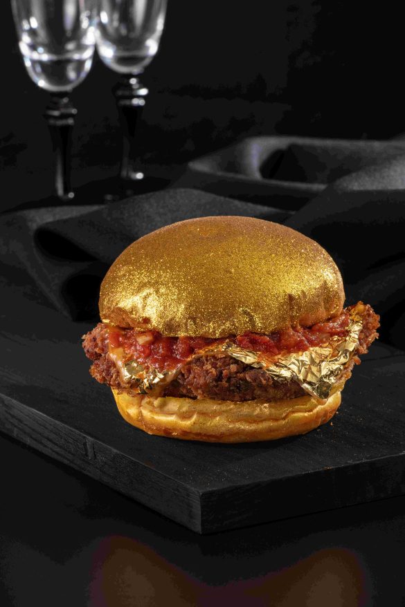As hamburguerias que fazem parte do guarda-chuva do Grupo Rão também ganharam versões à base de folhas de ouro. É o caso da marca Ogroo Steaks, com 17 lojas e assinada pelo chef Jimmy Ogro, onde a chancela gold ganha lugar no McManis (R$ 89,90) – servido com pão pretzel, blend de carne, american cheese, cebola caramelizada, maionese artesanal de alho confitado e finalizado com folhas de ouro. Já no Rão Burger, com 16 unidades, o ingrediente premium é servido no PCQ (R$ 75,90) – pão, carne, queijo coberto com folhas de ouro e molho. No Rão Chicken, com 14 unidades, é o Chicken Parmegiana (R$ 69,90) – pão brioche, peito de frango empanado, molho de tomate pelati, queijo e ouro – que ganha uma versão especial com o insumo.