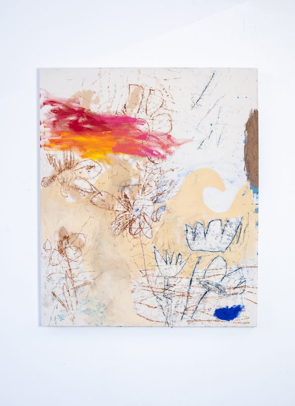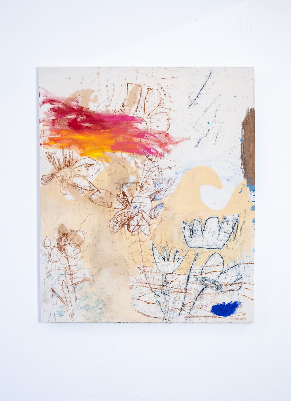 “Em meio à aparente abstração, surgem símbolos: coqueiros, ondas e outros elementos tropicais evocam cenas do cotidiano carioca — cidade natal de Knesse e onde a exposição se realiza. As cidades litorâneas são espaços onde o desejo constantemente invade as ruas, configurando um entrelugar entre praia e asfalto. “Movimento” talvez seja a palavra que melhor define essa relação com uma paisagem também em constante mutação. Esse dinamismo parece orientar o aparecimento das formas e a precisão cromática de sua pintura. Ao mesmo tempo, revela o desejo do artista de compor com os materiais e investigar suas propriedades — aspectos fundamentais nesta exposição. Em sua individual, temos a oportunidade não apenas de testemunhar as distintas possibilidades das materialidades, mas de observá-las em diferentes arranjos expográficos”, avalia a curadora.