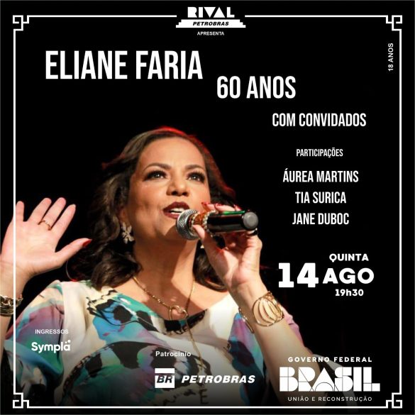 A cantora e compositora Eliane Faria sobe ao palco do Teatro Rival Petrobras (Rua Álvaro Alvim 33, Cinelândia), no dia 14 de agosto, quinta-feira, 19:30h para comemorar seus 60 anos de vida e mais de três décadas dedicadas à música brasileira e apresentará show inédito para essa data tão especial.