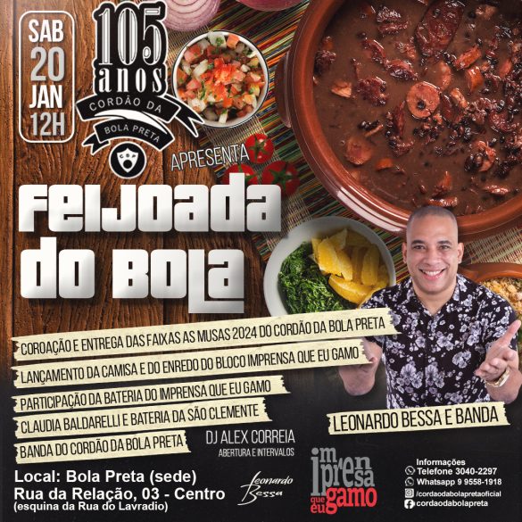 Dia 20 de janeiro tem a segunda edição da Feijoada do Bola de 2024. A tradicional Feijoada já está em clima de carnaval e reúne diversas atrações no esquenta para seu desfile, que acontece no sábado de carnaval.