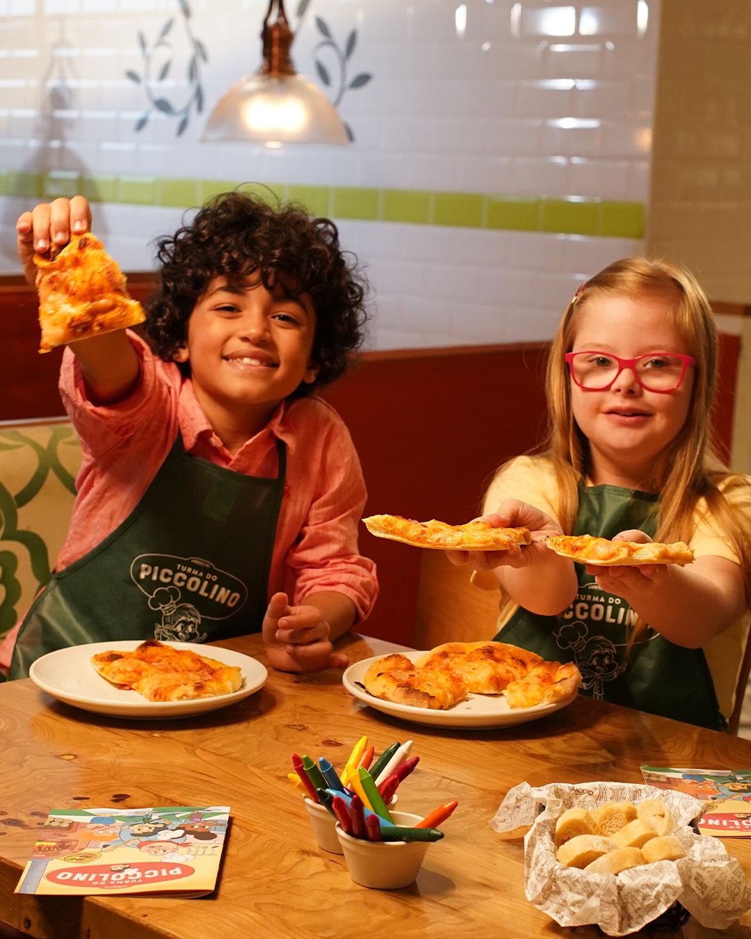 E, complementando a experiência, as crianças têm a oportunidade de se tornarem verdadeiros pizzaiolos! Elas preparam a própria pizza, decoram conforme sua imaginação e se divertem durante o processo. Além disso, eles podem levar para casa um avental culinário e um livro de atividades da Turma do Piccolino, que são os personagens da rede.