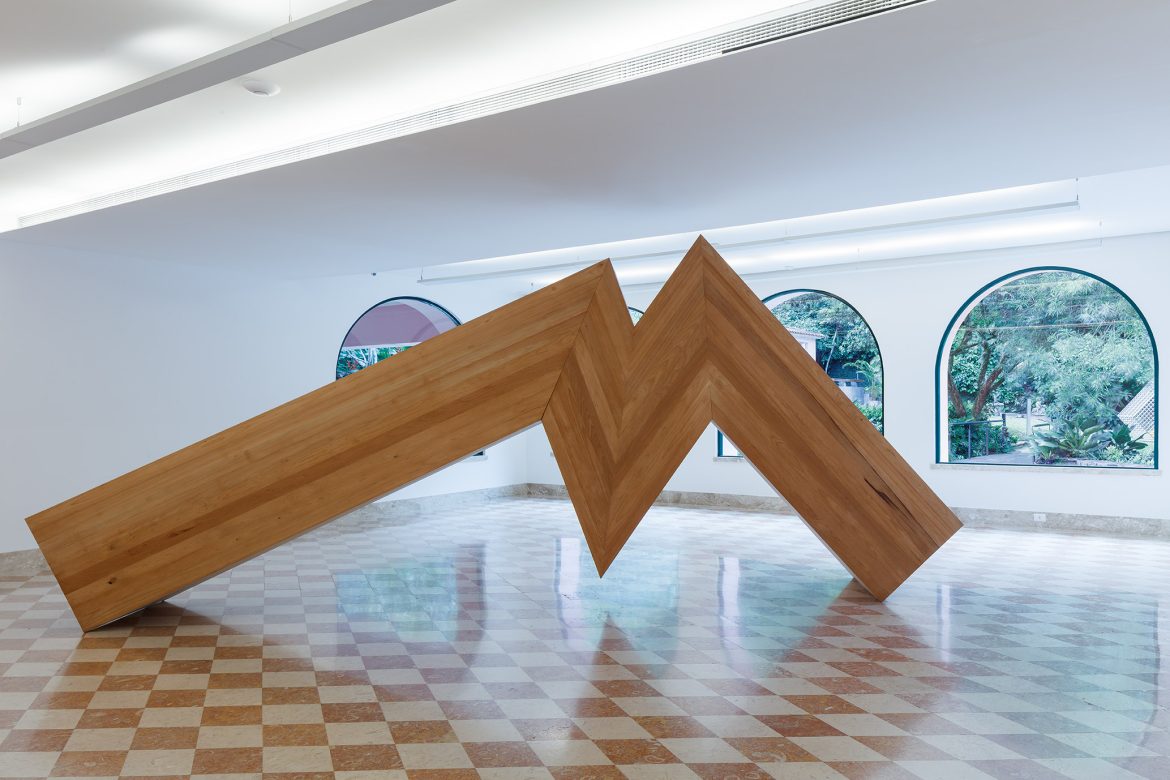 No primeiro grande salão da Casa Roberto Marinho, a escultura Fitangular Longo (1984) revela a imponência do material em sua forma natural, evidenciando uma técnica de colagem de ripas que cria uma gradação de tons e dá corpo à peça. Com mais de seis metros de comprimento, a escultura domina o espaço, interrompendo o diálogo visual entre o interior e o jardim através das amplas janelas de vidro.