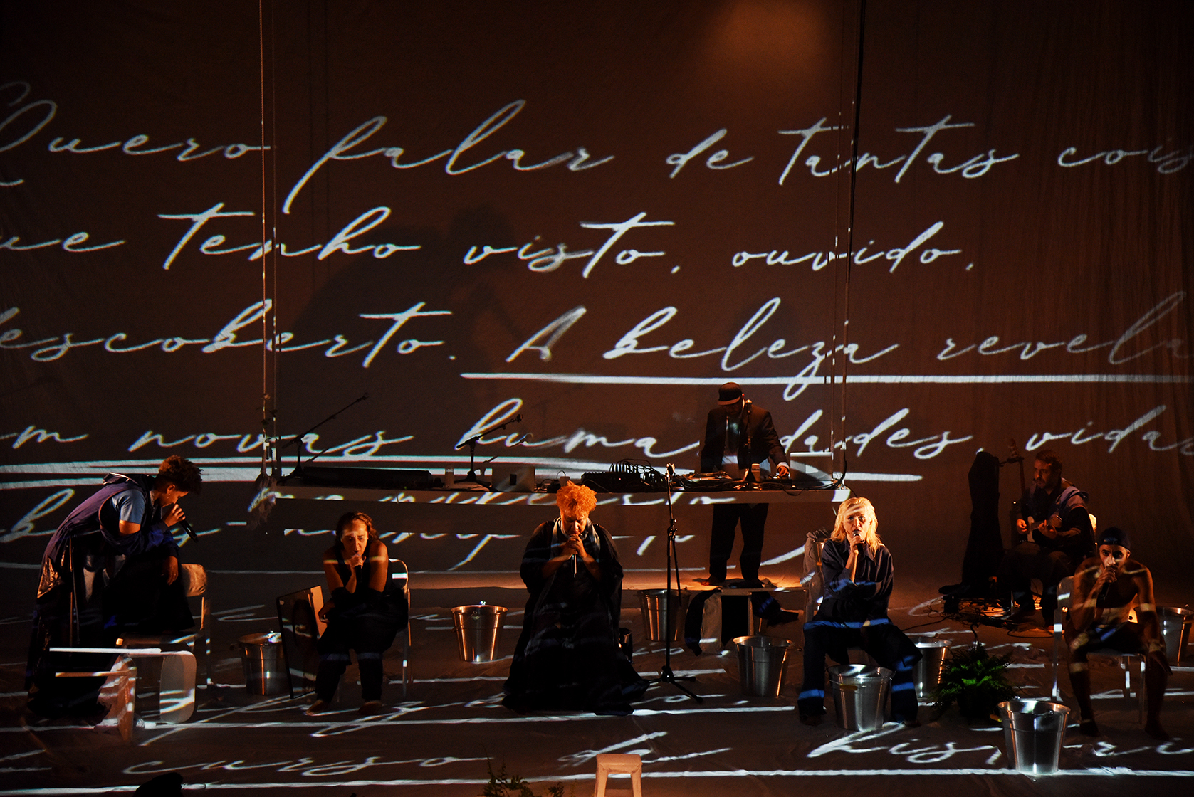 Além dos quatro membros-fundadores do Núcleo – Claudia Schapira, Eugênio Lima, Luaa Gabanini e Roberta Estrela D’ Alva – o espetáculo conta com Cristiano Meirelles, Dani Nega e Daniel Oliva, artistas-aliados que já colaboraram com o coletivo em outras produções. Através da imagem, outras vozes se somam ao trabalho: Adeleke Adisaogun Ajiyobiojo, Aretha Sadick e Zahy Guajajara se apresentam ampliando o discurso do espetáculo, que evoca de forma mais coletiva e diversa a construção de outros imaginários.