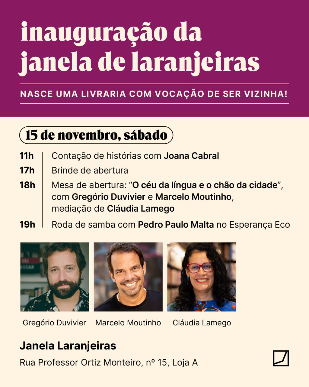 Na sequência, o brinde de boas-vindas oficializa a inauguração da Janela Laranjeiras. O grande momento acontece às 18h: Gregório Duvivier e Marcelo Moutinho, com mediação de Cláudia Lamego, participam da mesa de abertura inspirada no tema “O céu da língua e o chão da cidade”.