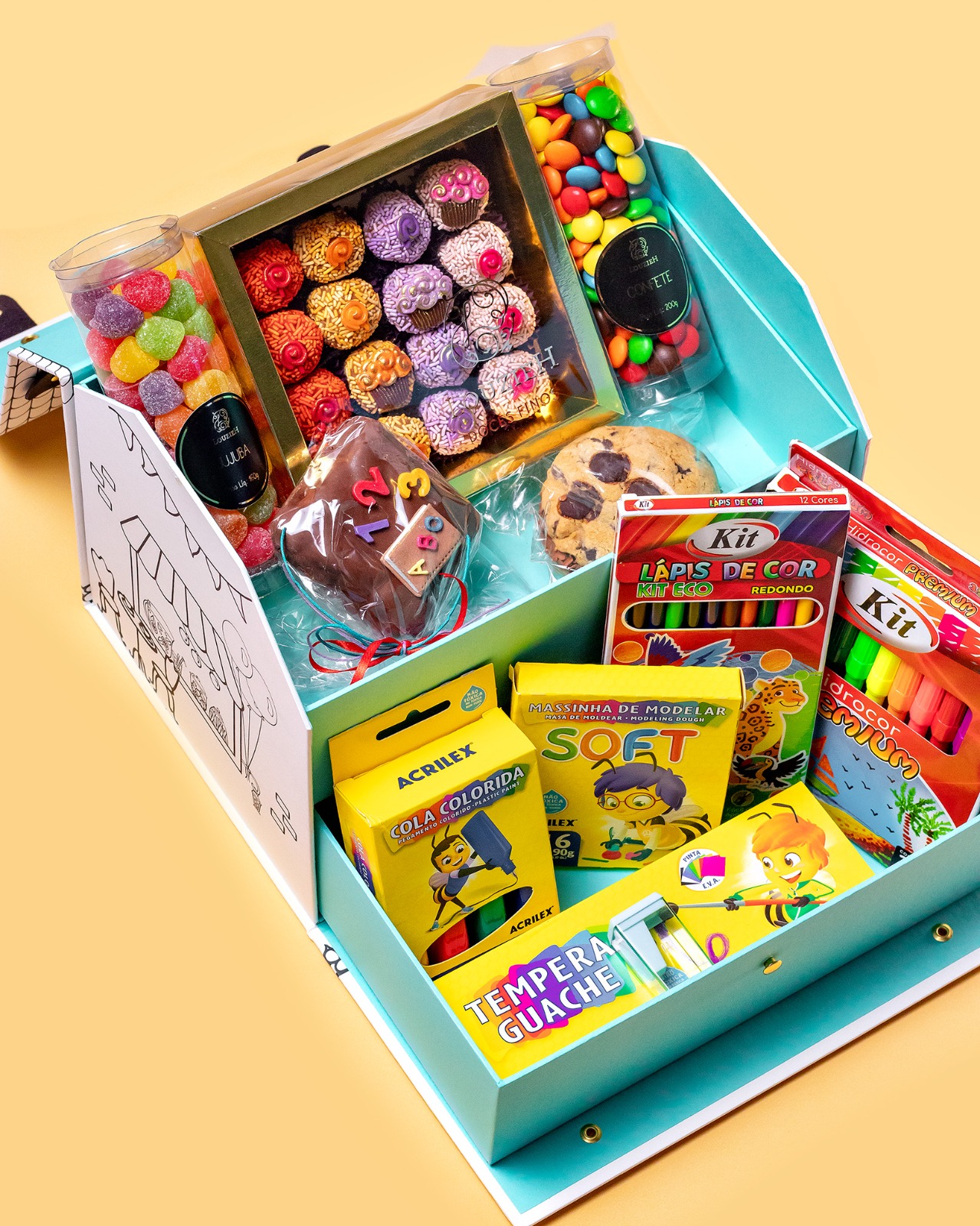 O presente, em formato de casinha, foi pensado para unir diversão e sabor em uma única experiência. Cada criança pode pintar e personalizar sua própria caixa, que vem acompanhada de lápis de cor, canetinhas, materiais de pintura e massinha de modelar.