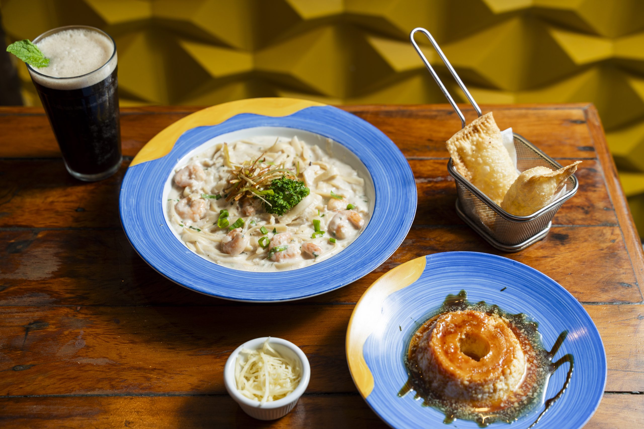 Categoria 2: 2 pastéis de carne ou queijo + Tagliatelle de camarão ao molho de limão siciliano + Pudim