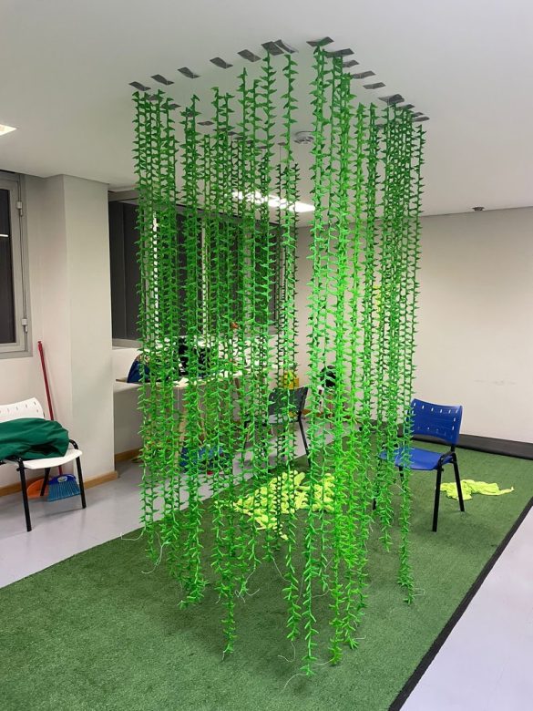 “Plantas do Baile” é uma série iniciada e aprofundada pelo artista Tainan Cabral ao longo da residência. Materiais como 10 mil bicos de lança-perfume — usualmente conhecidos como “bico verde” —, dispostos em corrente, simulam a queda das folhas de plantas trepadeiras e, em outros casos, com auxílio de hastes de sustentação, reproduzem a folhagem mais densa de palmeiras. A obra apresentada ilustra uma ideia de ambiente do baile. O título “selva do baile/baile da selva” é uma referência à natureza que inspira o trabalho do autor e, ao mesmo tempo, o nome de uma favela de Senador Camará, Zona Oeste do Rio, onde acontece um baile que é rodeado de montanhas e de natureza.