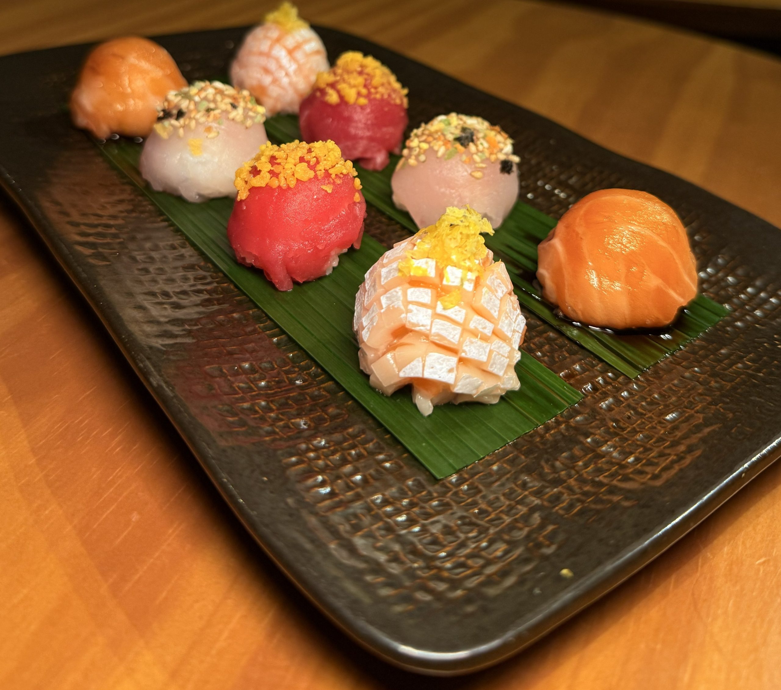 O combinado traz uma seleção de peixes frescos da casa, como atum, salmão, cavala (peixe branco) e barriga de salmão (parte nobre), e para deixar a experiência ainda mais divertida, o menu (R$ 78) inclui uma sobremesa surpresa com algodão doce.