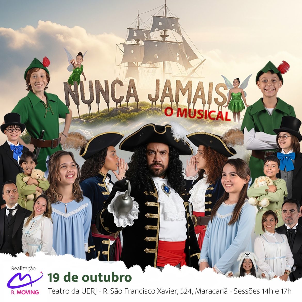 O clássico Peter Pan ganha uma versão inédita e emocionante no espetáculo Nunca Jamais, que estreia no dia 19 de outubro, no Teatro da UERJ, no Maracanã. Com duas sessões especiais, às 14h e 17h, a montagem reúne mais de 50 artistas em cena em uma produção grandiosa que promete conquistar crianças, jovens e adultos.