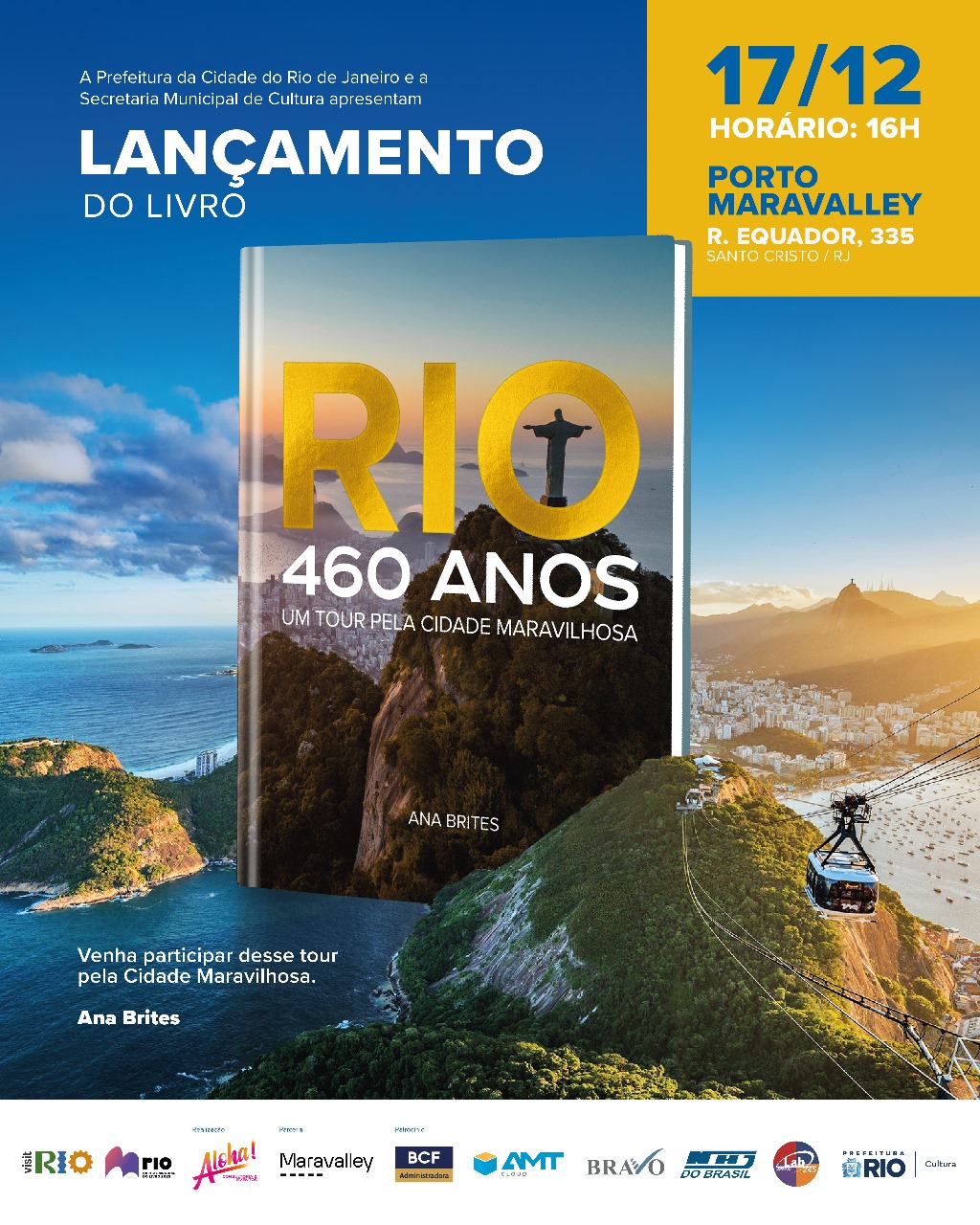 O livro “Rio 460 Anos – Um Tour pela Cidade Maravilhosa” é uma homenagem ao Rio de Janeiro com mais de quatro séculos de história. Oferece um passeio destacando a sua diversidade, beleza e importância lendária para o Brasil e o mundo, unindo memória, arte, música, arquitetura, tecnologia e projetos sociais que marcaram a trajetória da cidade. A escritora e produtora cultural Ana Brites faz o lançamento da obra com prefácio de Lucas Padilha (Secretário Municipal de Cultura), no dia 17/12, quarta-feira, às 16 horas, no Porto Maravalley, que fica na zona portuária.