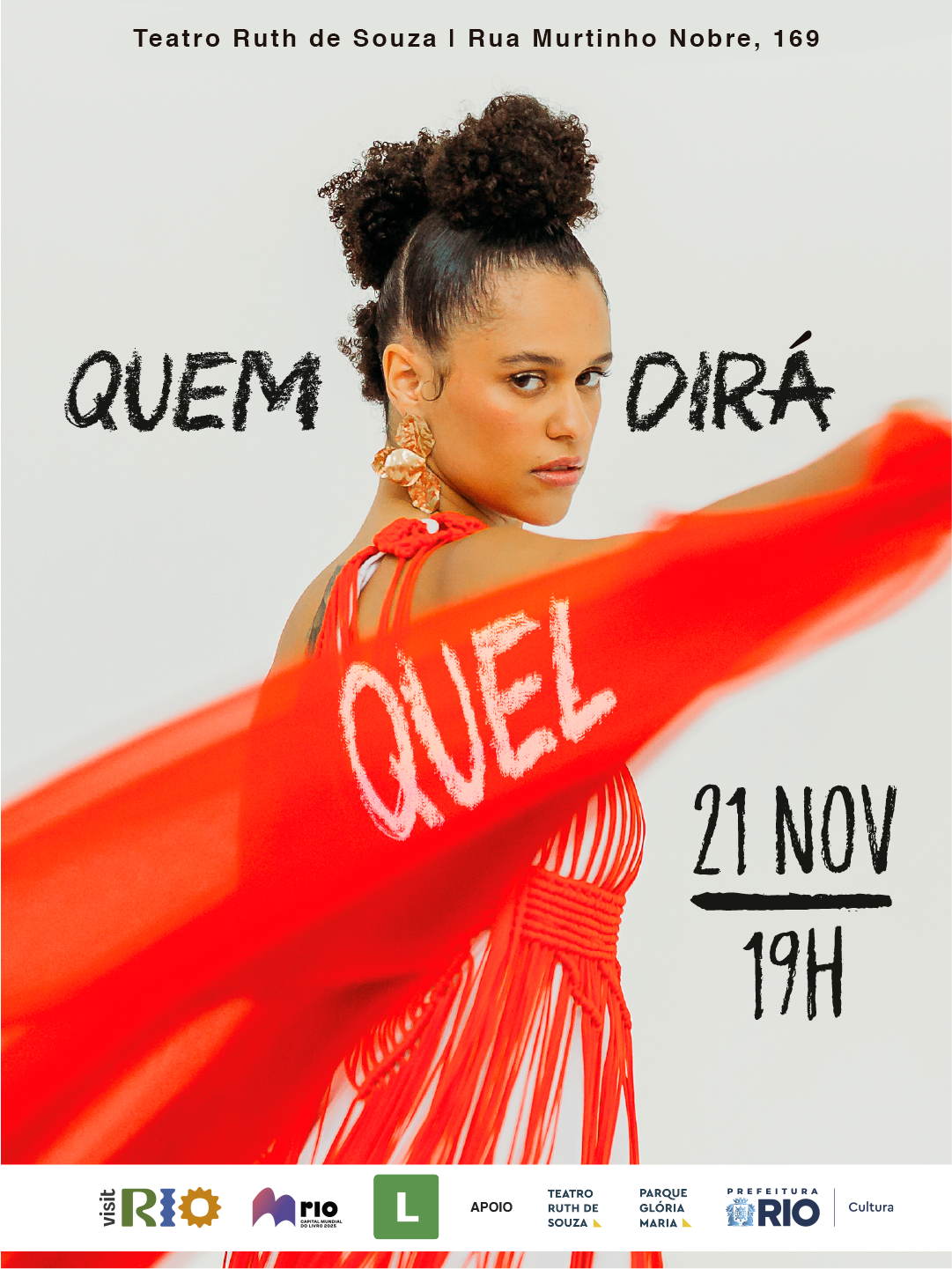 A multiartista Quel sobe ao palco do Teatro Ruth de Souza, dia 21 de novembro apresentando o espetáculo musical, “Quem Dirá”, uma profunda imersão que celebra a riqueza e a diversidade da música brasileira a partir de uma poderosa perspectiva afro-brasileira. O show convida o público a uma jornada de autoconhecimento e espelhamento, onde a gramática dos tambores resgata a ancestralidade e costura por meio dos sons rituais, o encontro entre passado, presente e futuro. O show contará com as participações especiais de Luiza Loroza e Ana Bispo.