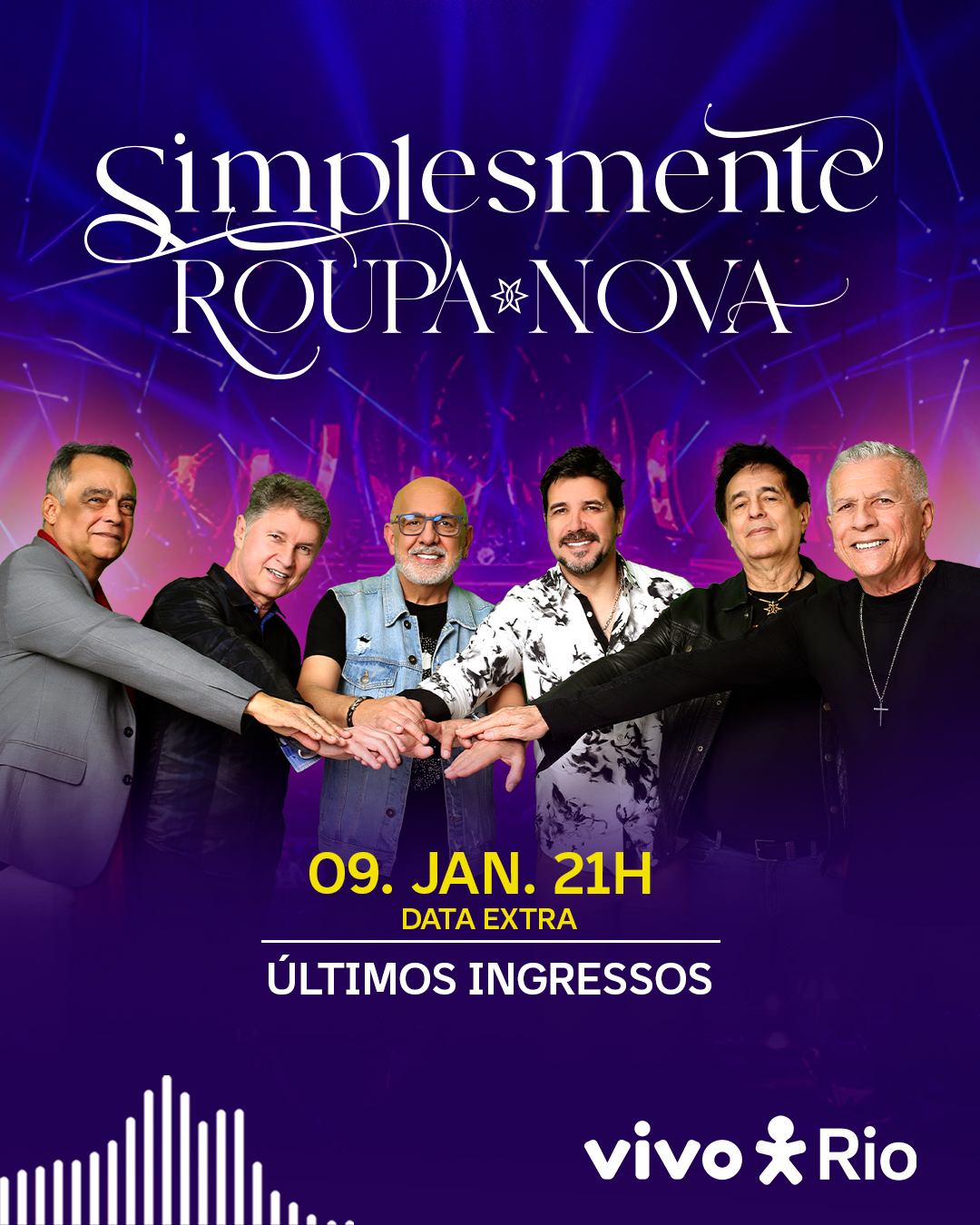 Uma das bandas mais emblemáticas da música brasileira, Roupa Nova está na estrada com a turnê “Simplesmente Roupa Nova”. Após rodar o Brasil com o show “Roupa Nova – 40 anos”, a banda agora está emocionando o público revisitando sucessos que marcaram gerações, além de apresentar novidades e releituras especiais em um show intimista, moderno e repleto de emoção, com direito à interação da plateia com os músicos. O grupo se apresentará nos dias 09 e 10 de janeiro, sexta-feira e sábado, no Vivo Rio