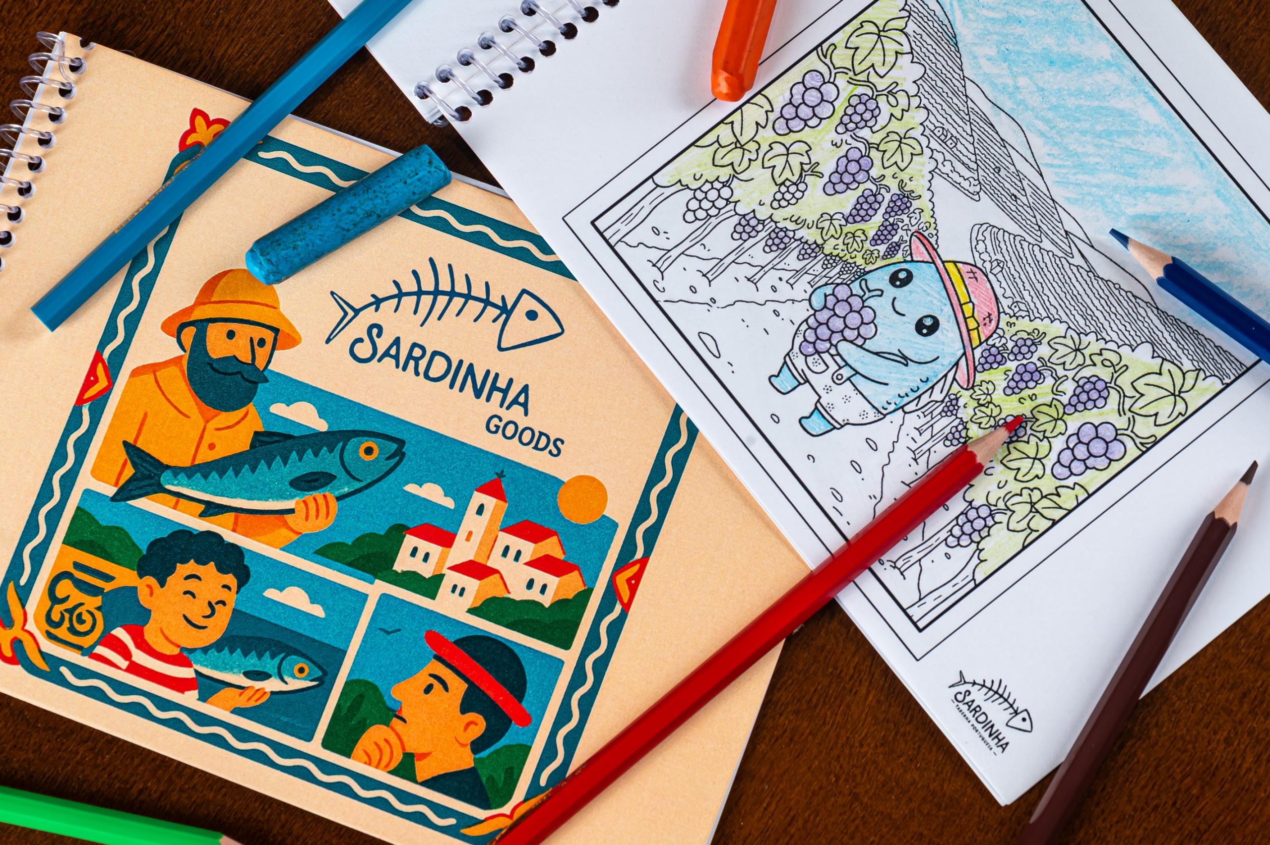 Inspirado no clássico Bobbie Goods, o Sardinha Goods traz ilustrações temáticas relacionadas ao universo da culinária portuguesa para as crianças colorirem durante a espera no restaurante. A proposta é transformar o momento da refeição em uma experiência de união, onde pais e filhos compartilham mais do que comida, mas também risadas, conversas e memórias.