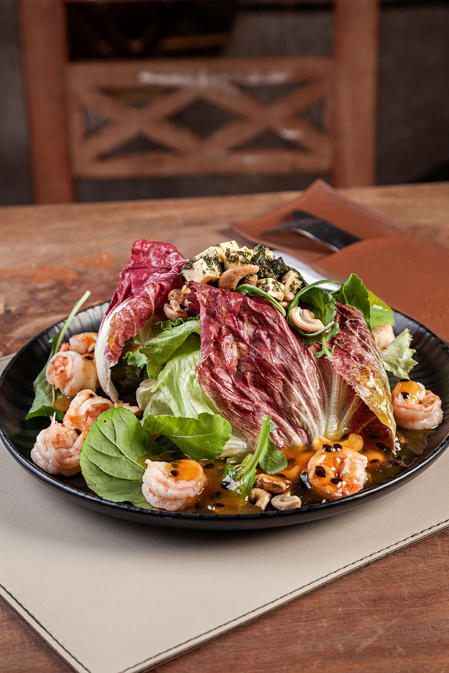 A Salada Brasileira “Francisco da Cunha Brandão” traz mix de folhas, castanha de caju, queijo Canastra marinado no pesto de manjericão, molho de maracujá e pipoca de queijo coalho, resultando em uma experiência leve, aromática e cheia de texturas – R$ 79,00.