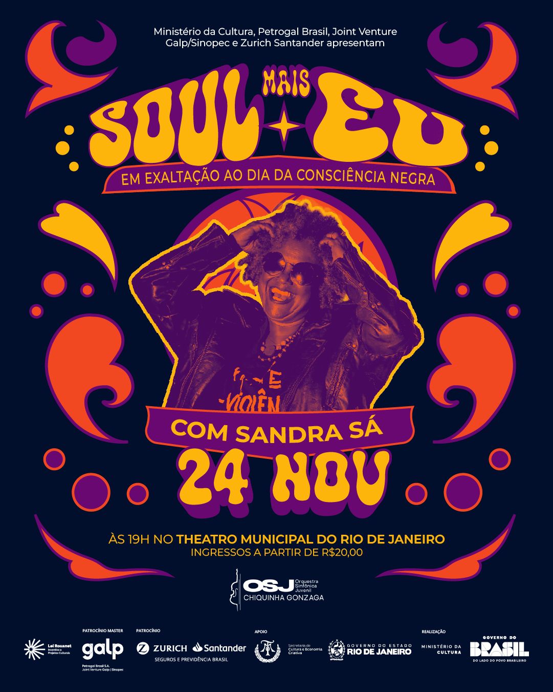 A cantora Sandra Sá é a convidada especial do concerto Soul Mais Eu – Exaltação ao Dia da Consciência Negra, que a Orquestra Sinfônica Juvenil Chiquinha Gonzaga apresentará no dia 24 de novembro no Theatro Municipal do Rio de Janeiro para celebrar a resistência e luta do povo negro por uma sociedade igualitária. O projeto tem patrocínio master da Petrogal Brasil, joint-venture Galp/Sinopec e patrocínio da Zurich Santander, por meio da Lei Federal de Incentivo à Cultura, além do apoio do Theatro Municipal do Rio de Janeiro e da Secretaria de Estado de Cultura e Economia Criativa do Rio.