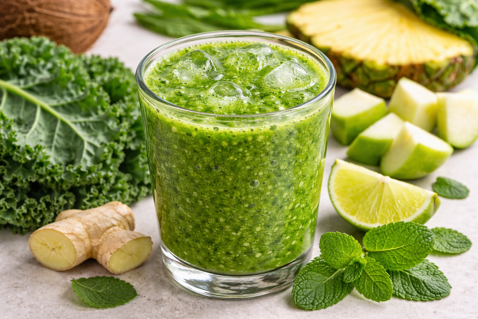 A combinação do frescor das folhas verdes com a picância termogênica e a hidratação profunda das frutas cria uma bebida equilibrada, sem necessidade de adoçantes. É a escolha perfeita para começar o dia com energia renovada, combatendo o inchaço abdominal e devolvendo a vitalidade que o corpo precisa para retomar a rotina.