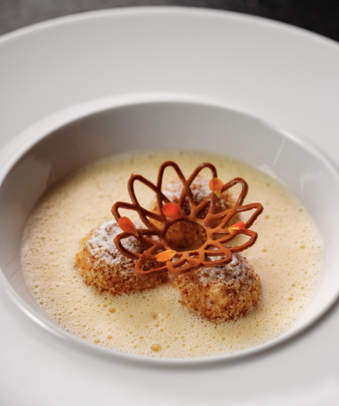 Para a sobremesa, Bolinho de queijo Quark com espuma de baunilha, framboesas e gianduia de amêndoas (R$49).