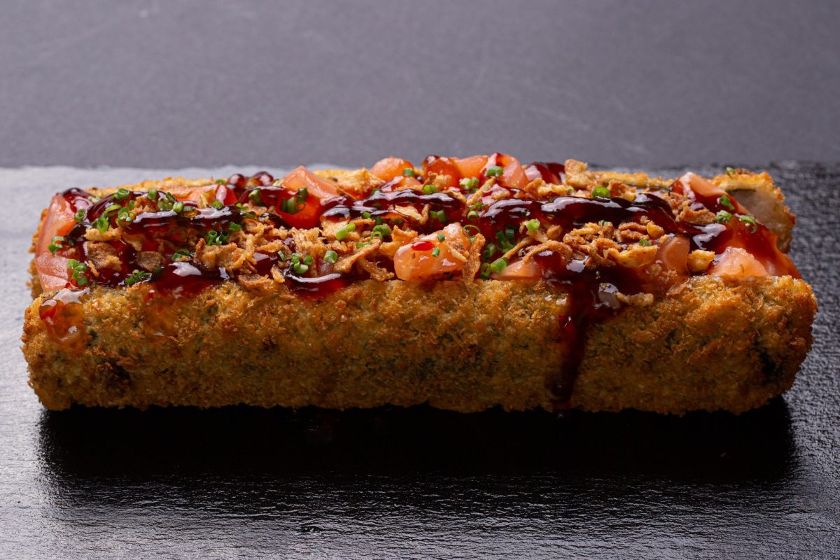 No lugar do pão, entra o arroz japonês delicadamente temperado e moldado com precisão, empanado como um hot-filadélfia. O recheio combina salmão fresco, cream cheese e cebola frita, um contraste de texturas entre o leve e o crocante. A finalização com cebolinha, gergelim e molho teriyaki acrescenta camadas de sabor e um toque aromático que remete à culinária oriental.