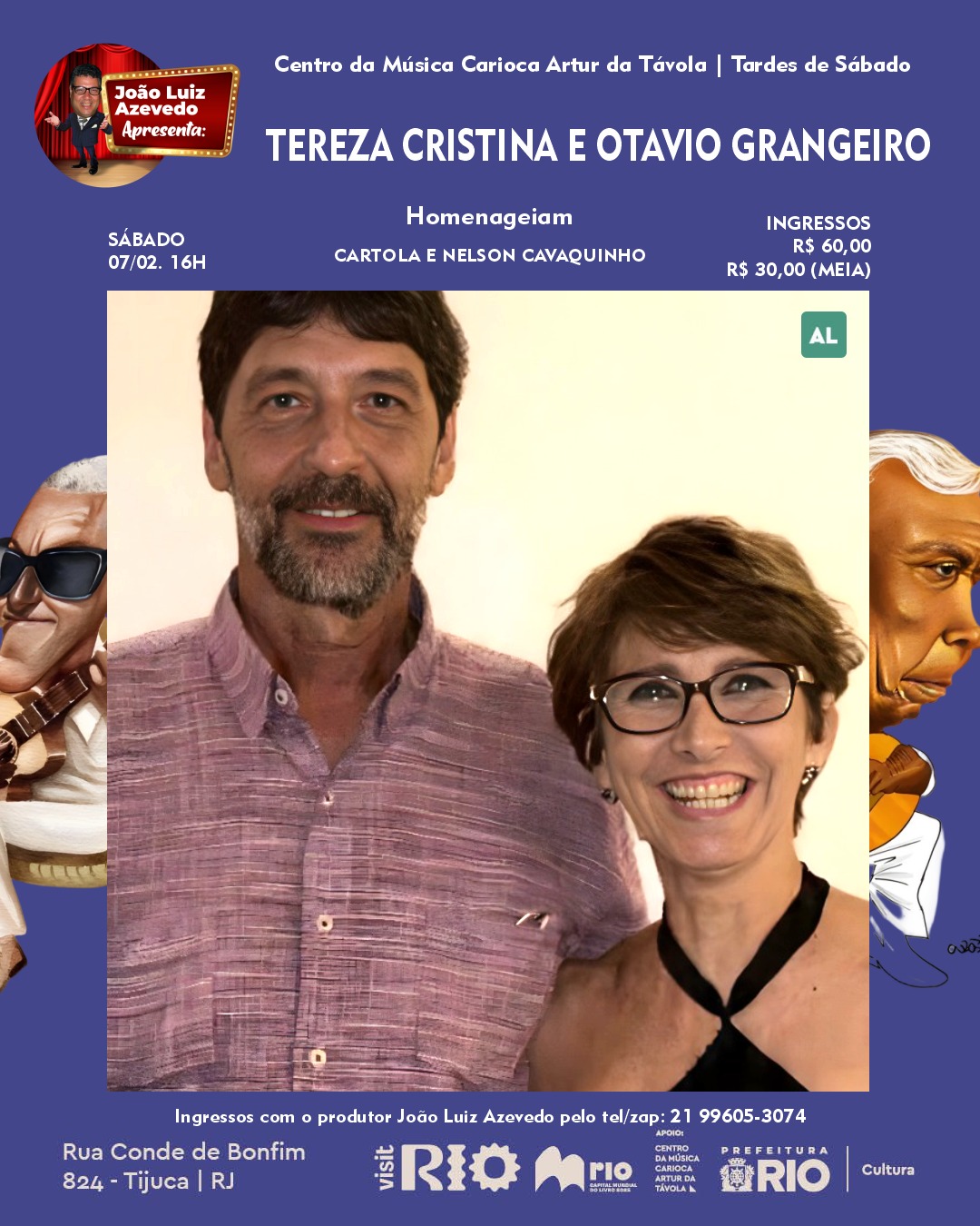 No próximo sábado, dia 10/02, as 16h, o Projeto Tardes de Sábado na Sala Sarau do Centro da Musica Carioca Artur da Távola ( Rua Conde Bonfim 824, Tijuca) e o produtor cultural João Luiz Azevedo apresentarão o show intimista da cantora TEREZA CRISTINA e o violonista OTÁVIO GRANGEIRO em homenagem aos Clássicos de Cartola e Nelson Cavaquinho como ‘As Rosas Não Falam’, ‘O Mundo é um Moinho’, ‘Alvorada’, ‘Folhas Secas’ e ‘Juízo Final’.
